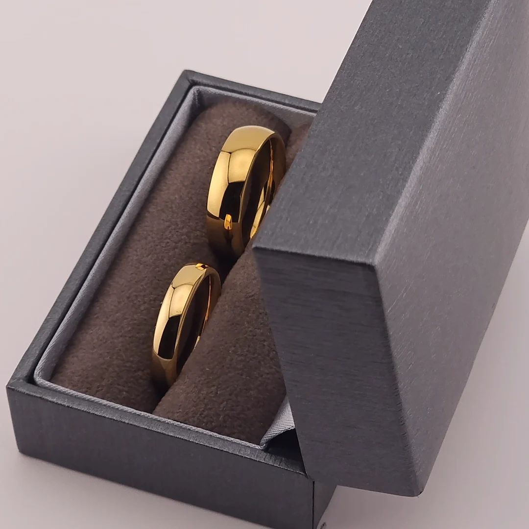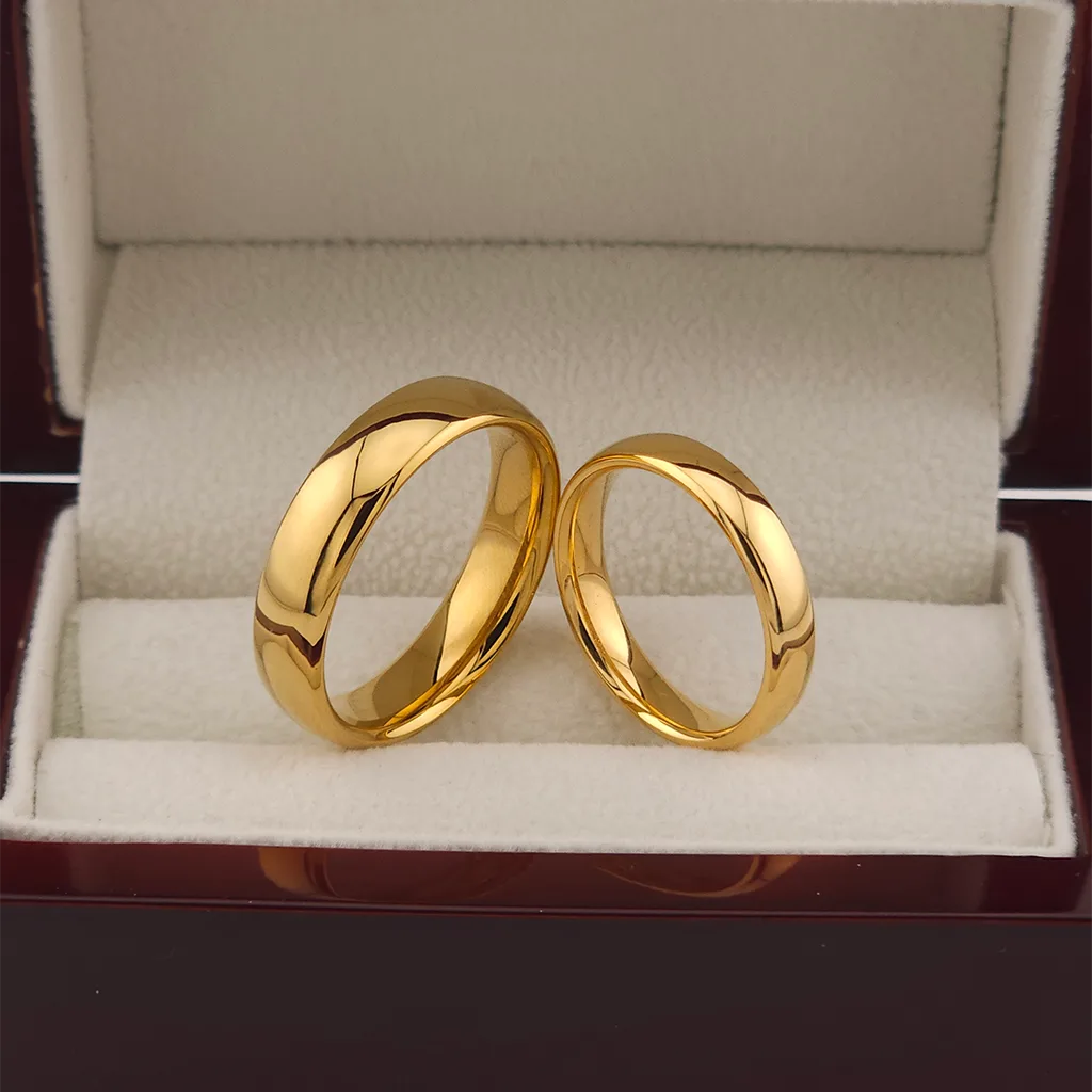 Klasszikus stílusú, fényes felületű páros nemesacél jegygyűrűk 18k arannyal bevonva.