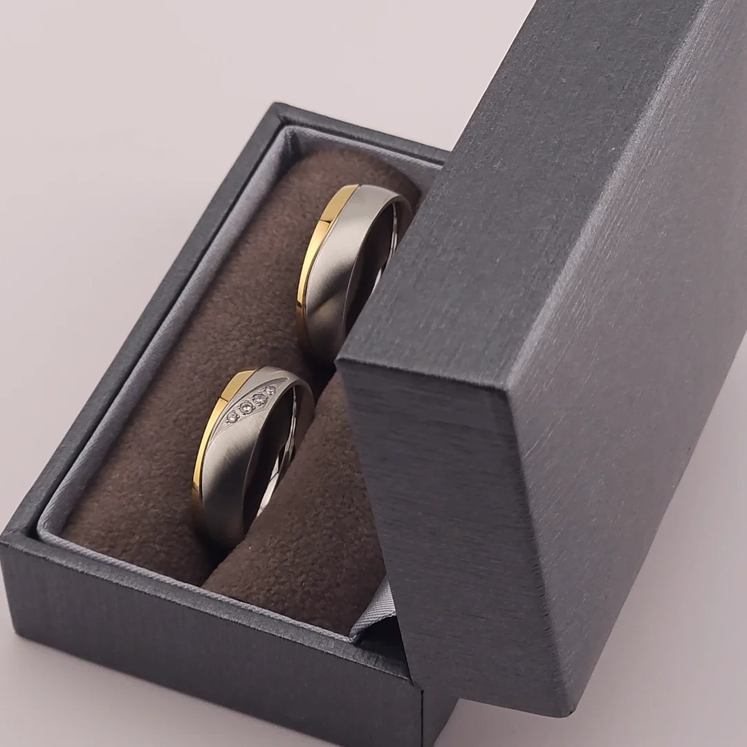 Modern, két tónusú páros karikagyűrű matt ezüstszínű felülettel, arannyal bevont fényes sávval. A női gyűrűt 4 db ragyogó cirkónia kő díszíti.